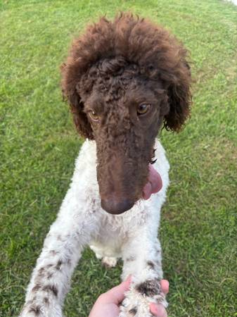 Standard male party poodle 10 months old. He loves cuddles outside playtime and playing fetch. He’s super easy to teach tricks too. He knows how to sit lay down shake speak and roll over. He loves to try and have all the attention. He is potty trained does very well with kids. He’s been good to our family, but unfortunately with me being a stay at home mom looking to return back to work. We won’t have the time we usually have with him.