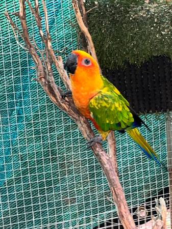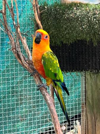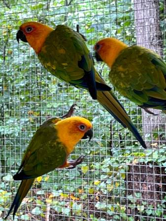 3 Hybrid Sun Conures with the dad being a Jenday Conure and the mother being a Sun Conure Message me at anytime with any questions ) there is a rehoming fee but is better priced than any retail...
