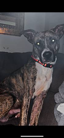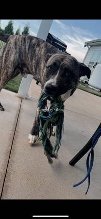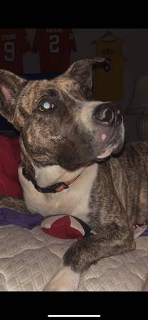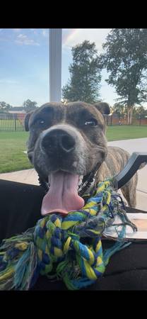 This is Buddy . He is about a year and a half , fully potty trained , crate trained , he knows basic commands & loves to play with his ropes/bones . Buddy is approximately 75lbs so he is a decent size dog . He’s currently at my mother in laws house and he needs to be rehomed ASAP . I’ve called shelters and all are full . He will come with everything they have for him , including bowls , indoor crate as well as a HUGE outdoor kennel with a roof , and of course any toys he has . Buddy is a pit mix and needs somewhere to run and probably other dogs to play with . If you have any questions feel free to call me or text me . Thank you . Ohhhh and he is up to date on ALL SHOTS .