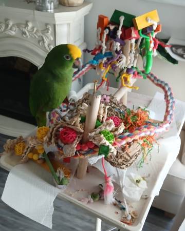 Small Amazon parrot looking for a home with bird experience. Comes with cage and everything. Yes she talks you know she is not a give a way.Great home only.