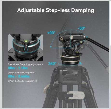 Professional Fluid Video Head: The fluid head is equipped with removable telescopic handle, which can be rotated and adjusted to make storage more compact. The adjusted length is 230-360mm / 9.05-14.17inch. And it suits both left-handed and right-handed users. With the handle, this tripod head can be tilted +90°/-60° and swiveled 360° for multi-angle shooting