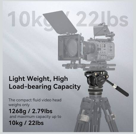 Max Load up to 10kg / 22Ibs: The maximum capacity of this tripod head can be up to 10 kg / 22Ibs. And the compact fluid video head weighs only 1268g / 2.79 Ibs, features 140mm / 5.51inch in height and a 75mm / 2.95inch diameter in base, which is convenient to carry