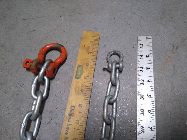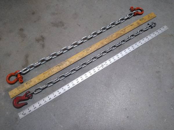 6 feet, in 2 pieces, with shackles and hook as shown. Sold my special project, never used.