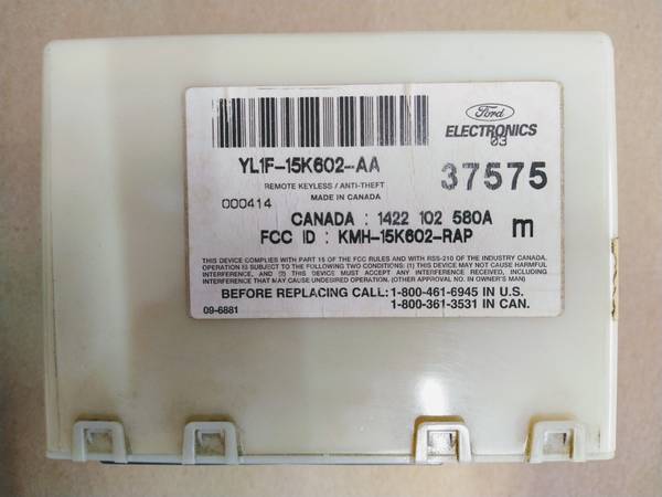 Ford Anti theft module YL1F-15K602-AA. Came from a 2000 Escort but seems to fit most Fords from that era like F-150s, Exhibitions, Windstars, Mustangs, Rangers and Taurus. Will need to be programmed...