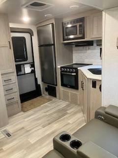 29'11", length 6988 wt, 194w solar panel, 1000 watt inverter, two batteries, 50 amp power, 12 volt refrigerator, microwave, gas cooktop and oven, gas/electric water heater, stereo/CD player with outside speakers, 42"TV, electric fireplace, gas duct heat, 15K duct air, outside shower, rear ladder 2" receiver hitch on rear bumper, spare tire with cover, three overhead vents with fans, electric awning with decorative lighting, 44" dinette with free standing table converting to a bed, two 60" theater-seating recliners which extend to sleepers, 60x80 queen bed, outside kitchen with stove, griddle, and a electric refrigerator, two outside doors. Both slide outs have slide toppers.ec The RV is like new. The outside kitchen, inside oven, bedspread, and decorative pillows have never been used. We used the camper 6 times. We are selling due to health issues. Edmunds October average retail value is $28,550.00.