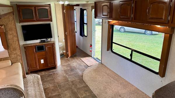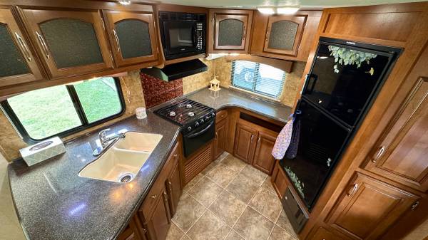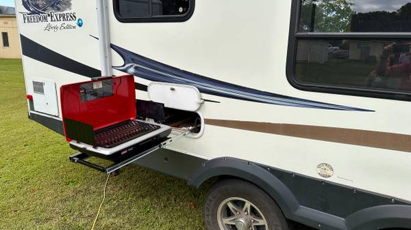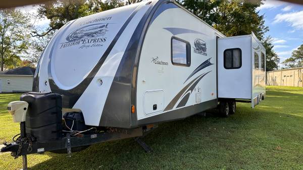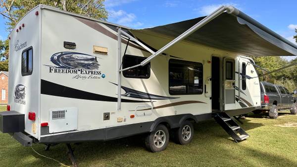 2013 Coachmen RV Freedom Express Liberty Edition 304RKDS Camper // Large Refrigerator with separate Freezer, Very large kitchen with a LOT of storage, Double Sink, 3 Burner Range w/Microwave, U-Dinette & Sofa Slideout w/Overhead Storage Above Sofa, Dinette and Sofa sleep 2 adults each, Entertainment Center, Side Aisle Bath w/Large Angle Shower, Toilet & Sink, Dual Bath Entry, Front Queen Bed w/Wardrobes on Both Sides, Large Pass-Thru Storage, Rear Bumper Storage Box, Upgraded Entry Stairs, Motion Sensing Exterior Lights (2), Slide out BBQ, 4 New Tires (1100 miles on them) and Much More!