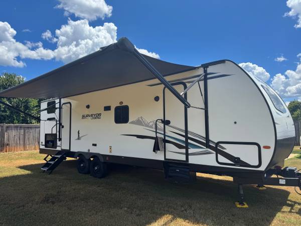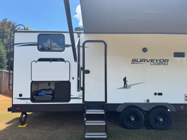 Elevate your camping game with this spacious 2021 Forest River Surveyor Legend travel trailer—perfect for larger families or groups seeking comfort on the road. At 35 feet long with a dry weight of just 6,806 lbs and hitch weight of 804 lbs, it’s towable by mid-size trucks and built tough with Azdel composite walls for lasting durability.