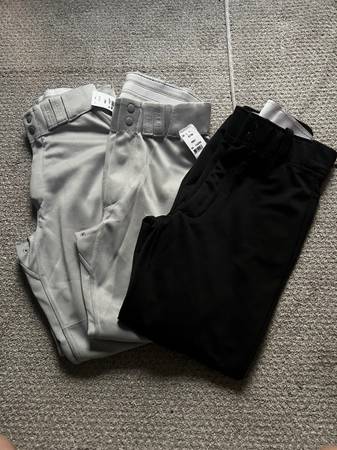 I have 3 New w/tags, different pairs of men's softball baseball pants. These are not the cheap, thin material kind. Two are gray and one is Black in color. All three are double snap elastic waistband with belt loops, zippered fronts, and rear pocket with long elastic legs.