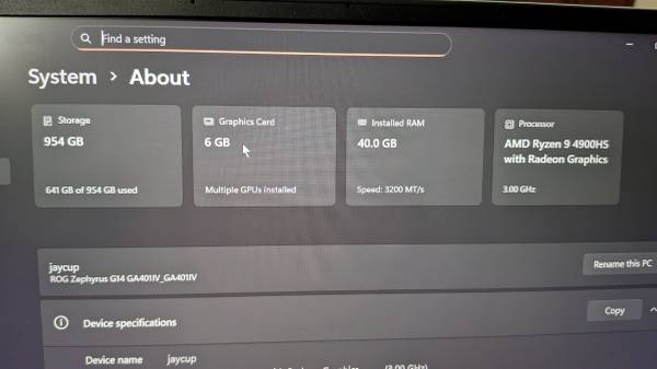 Selling my Zephyrus G14 Gaming laptop 2021. Selling so I don't get my car repo'd. Specs are as listed: Processor: Ryzen 9 4900HS Graphics: Nvidia Geforce RTX 2060 Max-Q Ram: 40 GB DDR4 Storage: 1TB...