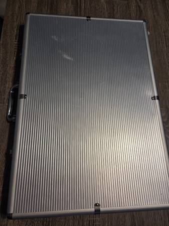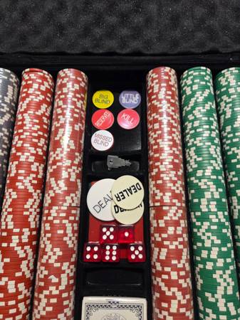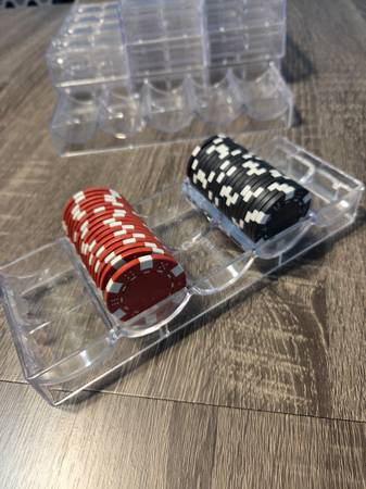 1000 11g poker chips with denominations printed on. Ten plastic chip holders included.