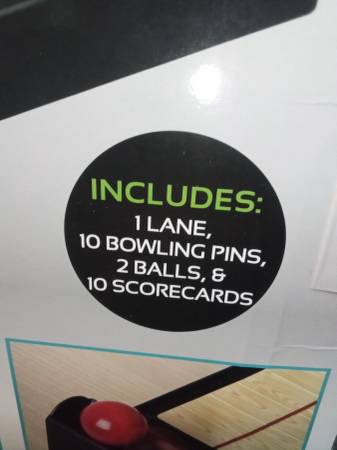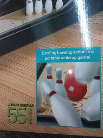 Emerson 10 Pin JUMBO Tabletop Bowling. Includes: 1 Lane, 10 Bowling Pins, 2 Balls and 10 Scorecards. New in Box. Smoke and Pet-Free Home. $38.00 Cash!!!