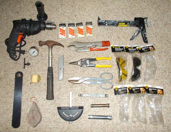 Lot of vintage and not so vintage tools. All are in good working condition. Warrior Hammer Drill Stanley Caulking Gun Stanley Brand Hammer Strait-Line Brand Chalk Line Reel Large Feeler Guage Ruler...
