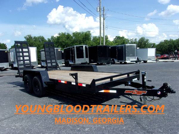 Down To Earth 16 Ft 5Ton Equipment Trailer- New. 10400# GVW, Duel 5200 Axles with brakes, LED lights, Stake pockets, 5K Jack, HD treated deck, HD Ramps with Mesh Cover and Spring Assist, Spare tire mount, HD Diamond plate fenders, Factory warranty. At Youngblood Motor Company 1600 Athens Hwy. Madison,Ga. 30650 Ph. 706-342-2242 http://youngbloodtrailers.com/- Financing Available...We carry many 5 ton and 7 ton equipment trailers in stock as well as gooseneck. Shop from large inventory!