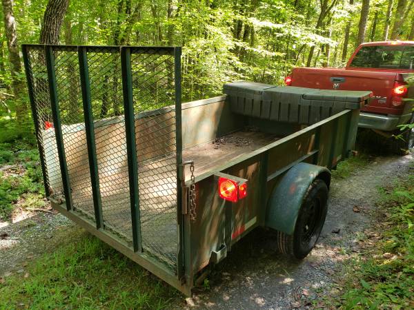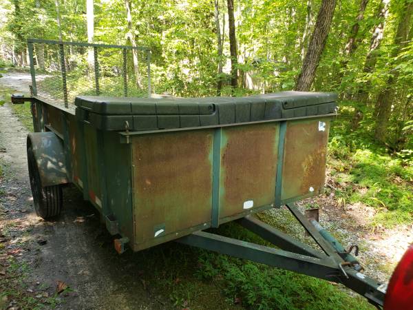 5x10 trailer with 2ft high metal sides. Lights and jack work, has new 15in wheels & tires, takes a 2in ball. Floor is weathered and could be replaced soon, but can be used as is. Has a title....
