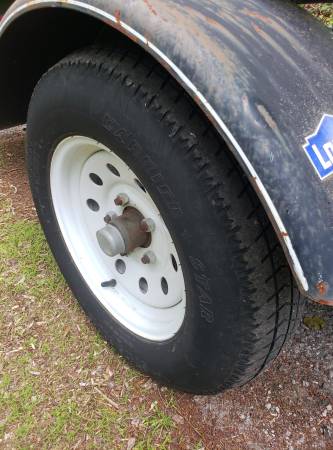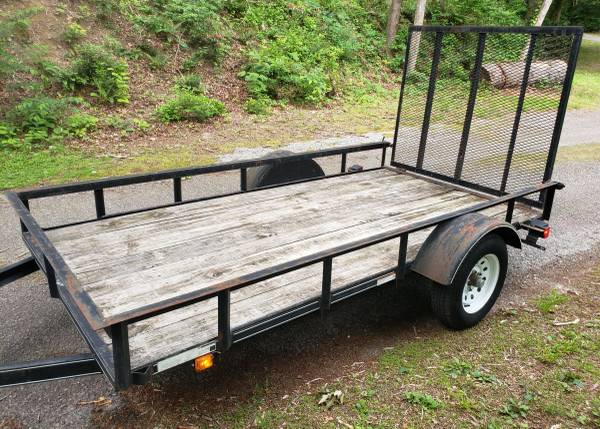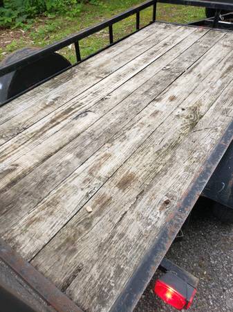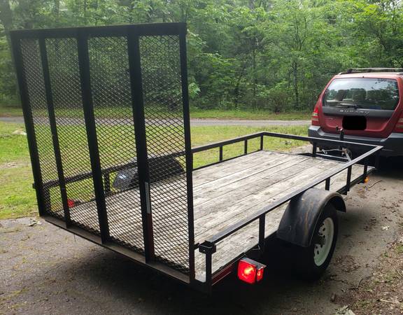 Lowes 5x10 utility trailer with jack (handle on jack is bent, but still works). Wood floor is good, lights work, takes a 2in ball. Has a brand new set of tires. No title, will write a bill of sale....